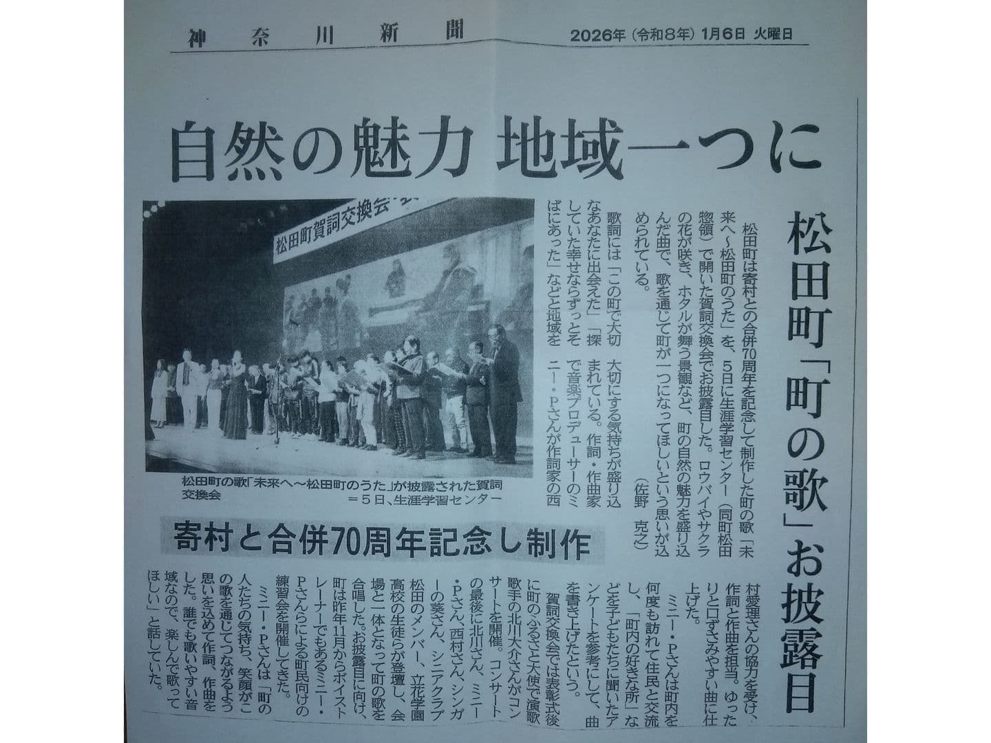 | 【2026年1月5日】生涯学習センター大ホールで開催された賀詞交換会の場で、新たに制作された松田町の歌「未来へ~松田町のうた」が披露されました。発表にあたり曲を作詞・作曲されたミニー・Pさん、歌手の北川大介さん、立花学園の生徒さんと共にシニアクラブのメンバー26名が登壇し会場一体となって合唱をいたしました。当日の模様は1月6日の神奈川新聞にも大きく報じられております。 |